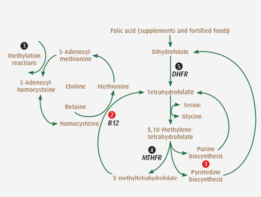 4 - MTHFR, which catalyzes the formation of 5-methylfolate needed for methylation reactions;5 - Dihydrofolate reductase enzyme.