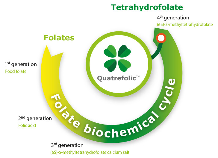 Quatrefolic® represents an innovative dietary ingredient designed to act as a nutrient in all areas where folic acid and folate supplementation has been recommended and allowed. The terms folic acid and folate are often used interchangeably for the water-soluble B-complex vitamin, essential for the maintenance of cellular functions and health. Folate deficiency is one of the most common vitamin deficiencies and eating folate-rich foods may not provide the recommended daily dosage; thus, the need for supplementation. Quatrefolic® is the glucosamine salt of(6S)-5-methyltetrahydrofolate and is structurally analogous to the reduced and active form of folic acid. Developed by Gnosis S.p.A, it represents the fourth-generation folate providing greater stability, higher water solubility and multiple ingredients formulation flexibility compared to 5-methyltetrahydrofolatecalcium salt guaranteeing an improved bio availability.