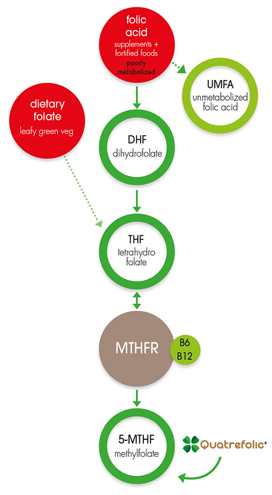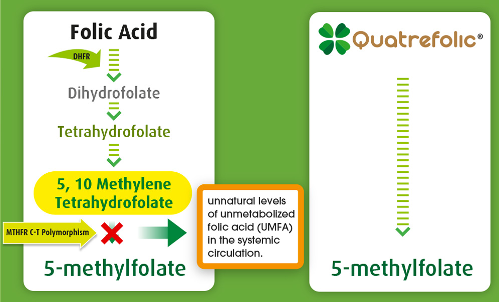 2-Quatrefolic® supplementation allows 5-methyltetrahydrofolate to be immediately bio available for its biological action without being metabolized in the body. Quatrefolic® is unlikely to mask vitamin B12 resulting in tangible advantages and more safe profile of the product respect to folic acid.
